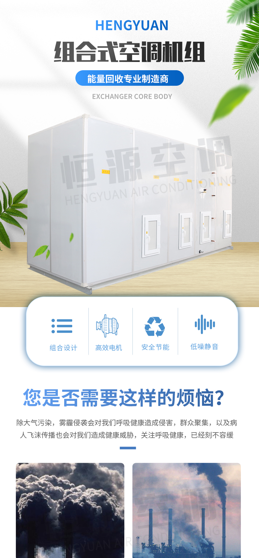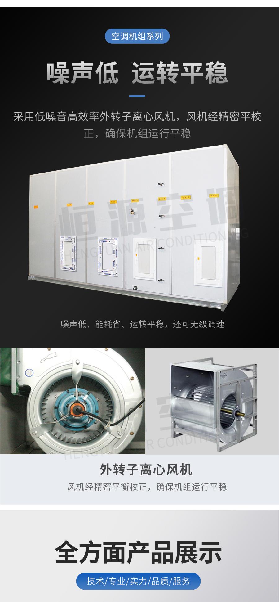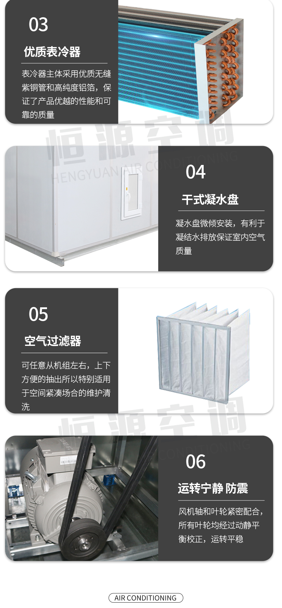 靖江市恒源空調設備制造有限公司——組合式空調機組是由各種空氣處理功能段組裝而成的一種空氣處理設備。適用于阻力大于100Pa的空調系統(tǒng)。 機組空氣處理功能段有空氣混合、均流、過濾、冷卻、一次和二次加熱、去濕、加濕、送風機、回風機、噴水、消聲、熱回收等單元體。